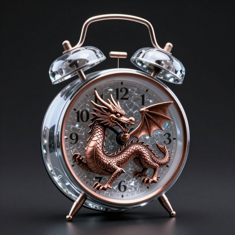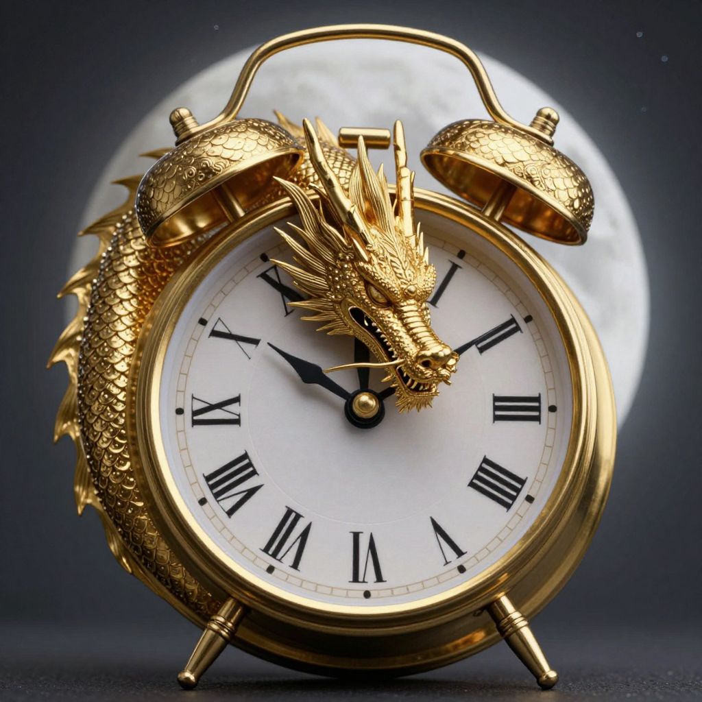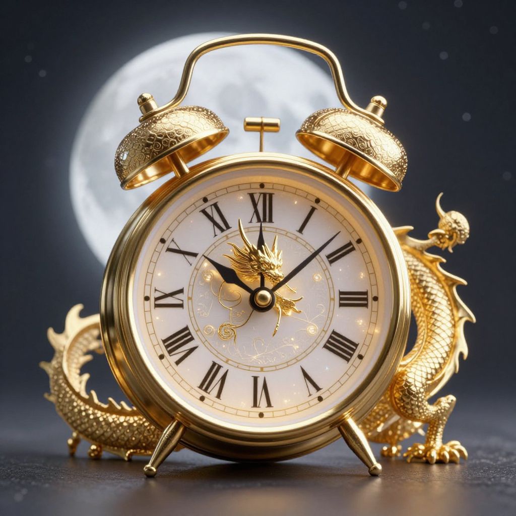 A golden dragon, intricately detailed and serenely slumbering, is encased within the face of a vintage alarm clock, its scales shimmering against a backdrop of ethereal moonlight and Roman numerals.