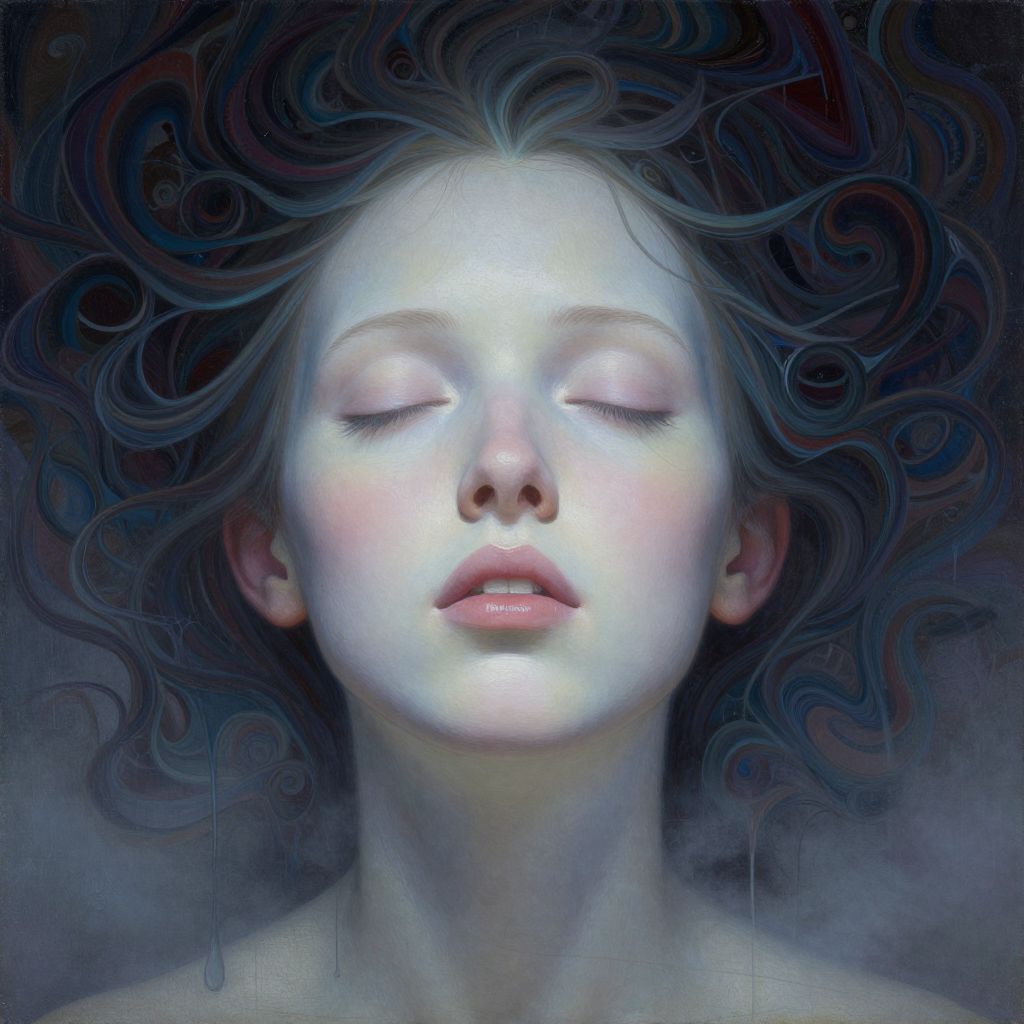 This is a digital painting of a serene, ethereal young woman with closed eyes and pale, almost glowing skin. Her dark, curly hair fans out around her head, blending into a dark, misty background. Her lips are slightly parted, showing a hint of pink. Her face is illuminated with a soft, white light, contrasting with the darker, swirling patterns surrounding her. The texture is smooth, with subtle gradients and delicate details, giving a dreamlike, otherworldly quality. The overall style is surreal, with a focus on light and shadow to convey a sense of calm and mystical beauty.
