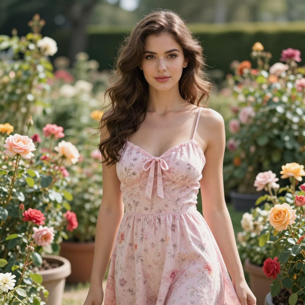 Photograph of a beautiful woman with long, wavy brown hair, wearing a pink, floral sundress with thin straps and a cute bow at the neckline. She stands confidently in a vibrant, blooming garden filled with colorful roses and potted plants. The sunlight highlights her fair skin and the dress's delicate fabric. The background is slightly blurred, emphasizing the garden's lush greenery and flowers.
