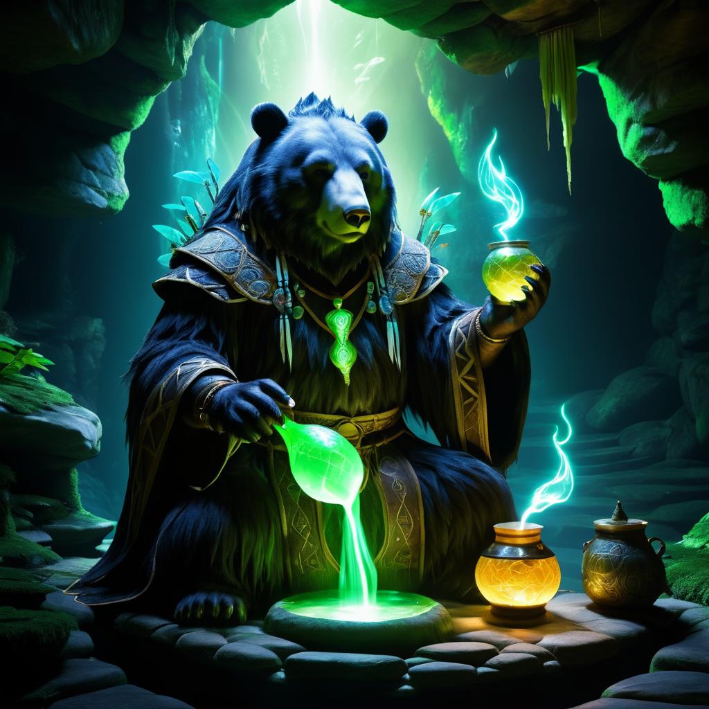 Anthropomorphic Bear Shaman Brewing Potion in Cave