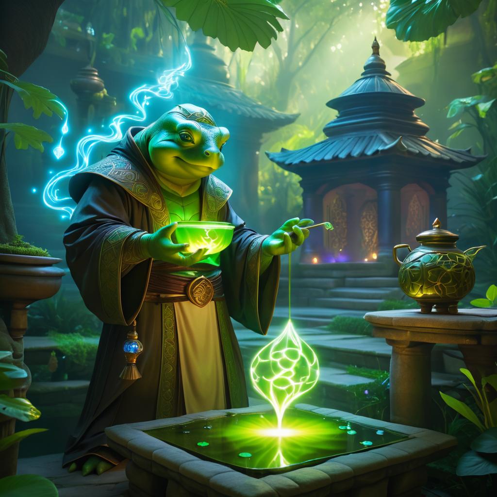 A detailed cinematic-style depiction of an anthropomorphic bear shaman dressed in elaborate robes and holding a glowing green vial while brewing a magical potion inside a mystic cave sanctuary with volumetric lighting and cascading waterfalls in the background. The bear holds a staff with a glowing spearhead and is surrounded by glowing enchanted jars on stone pedestals.