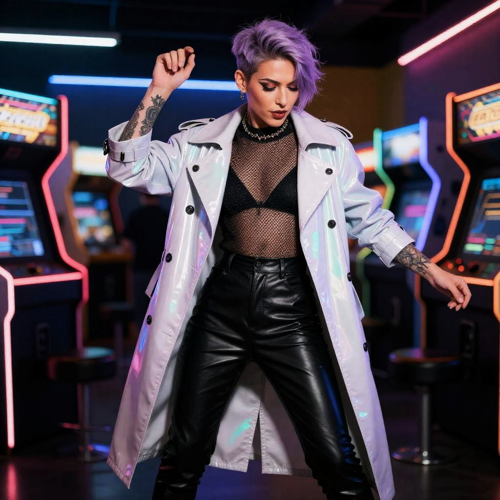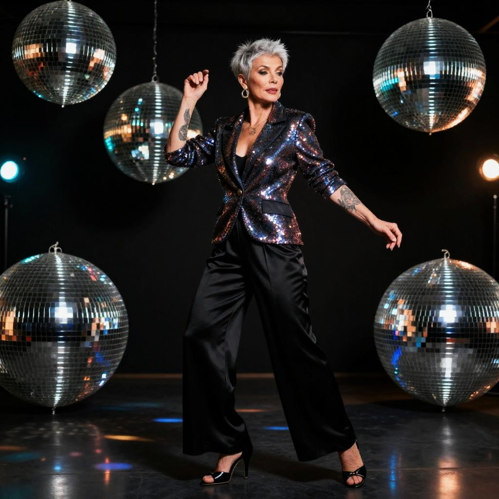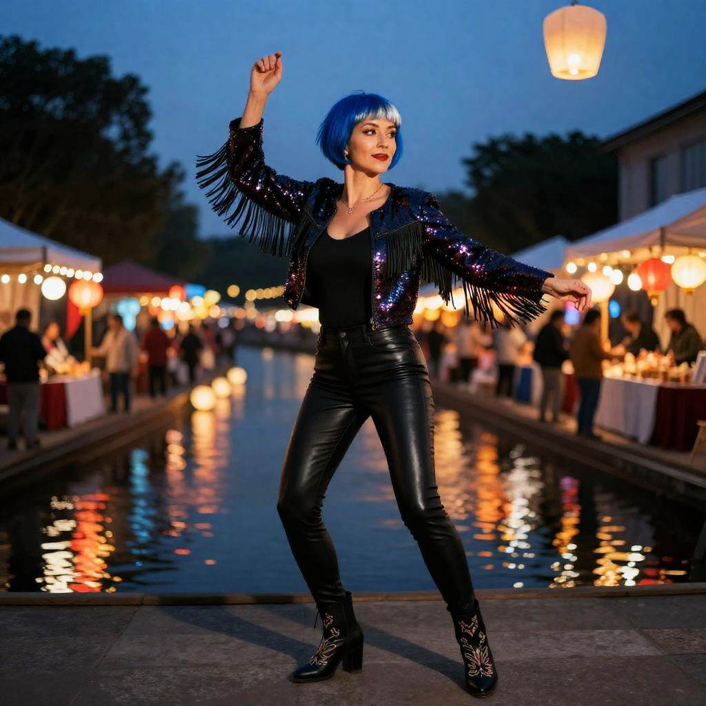 A 45-year-old woman with cobalt blue pixie cut and silver-streaked bangs, wearing a sequined fringe jacket, fitted leather pants, and embroidered ankle boots, dancing at a riverside lantern festival with floating paper lanterns and bustling artisan stalls, surrounded by colorful lights, highly detailed, 8k resolution, sharp, professional, clear, high contrast, high saturated, vivid deep blacks, crystal clear.