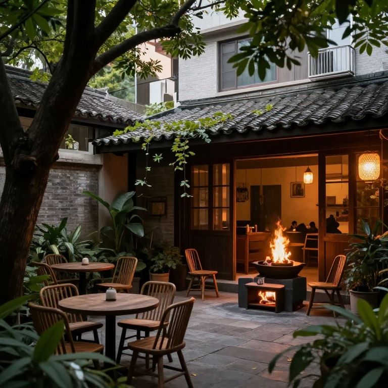 Photograph of a cozy outdoor patio at dusk. Wooden tables with striped chairs surround a central fire pit, where flames cast a warm glow. The patio is surrounded by lush green plants and a large tree. The background features a traditional-style building with a tiled roof and large glass sliding doors, reflecting the interior's warm lighting. A hanging lantern adds to the ambiance. The stone-paved floor and soft shadows create a serene, inviting atmosphere.