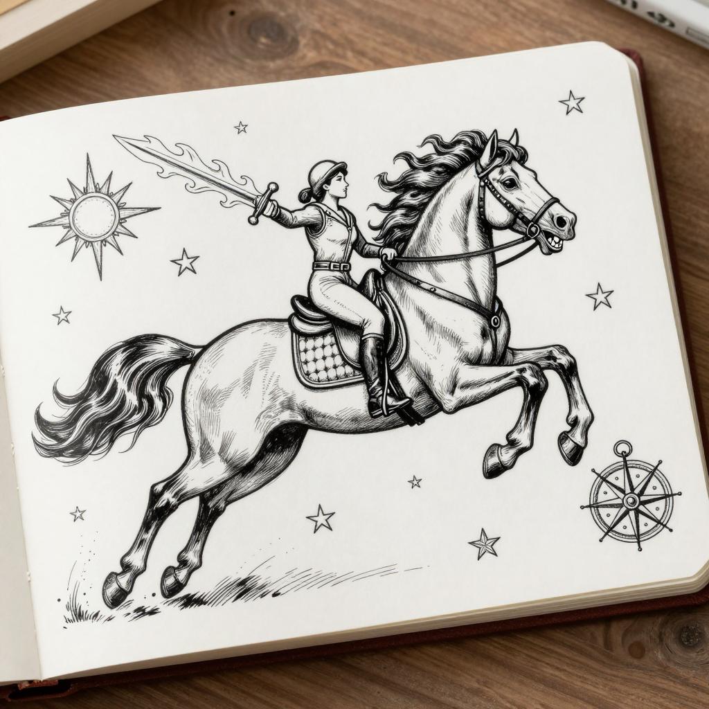 Illustration of a black and white, detailed ink drawing. A horse with a fiery mane and tail, ridden by a person with a flaming sword, flies through the sky. Stars, a sun with flames, and a compass are in the background. Open book on a wooden surface. The horse's mouth is open, showing sharp teeth. The rider holds the reins tightly. The horse's legs are extended, showing movement.
