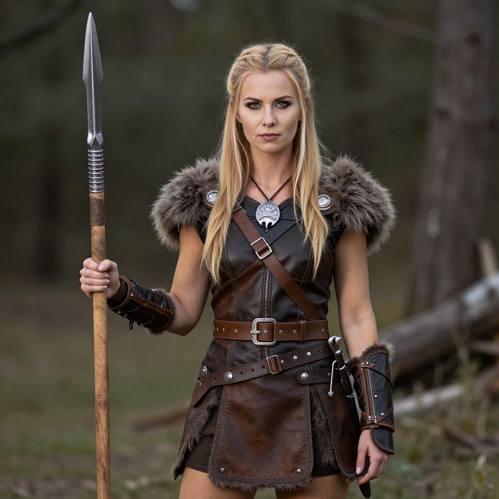 "Viking Warrior Girl Costume, a woman in a leather outfit holding a wooden spear"