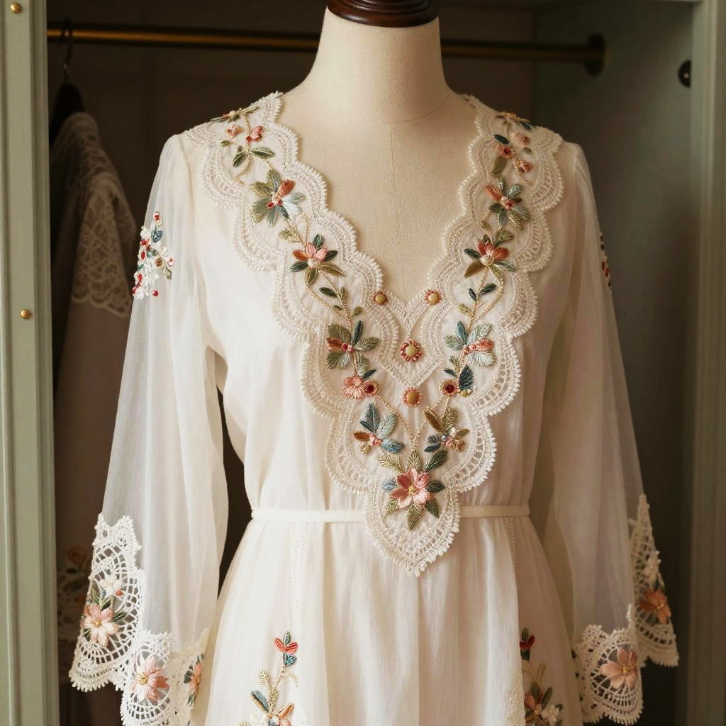 Intricate clothing featuring elaborate embroidery and delicate lacework, set against a softly lit vintage wardrobe background, highlighting craftsmanship and elegance