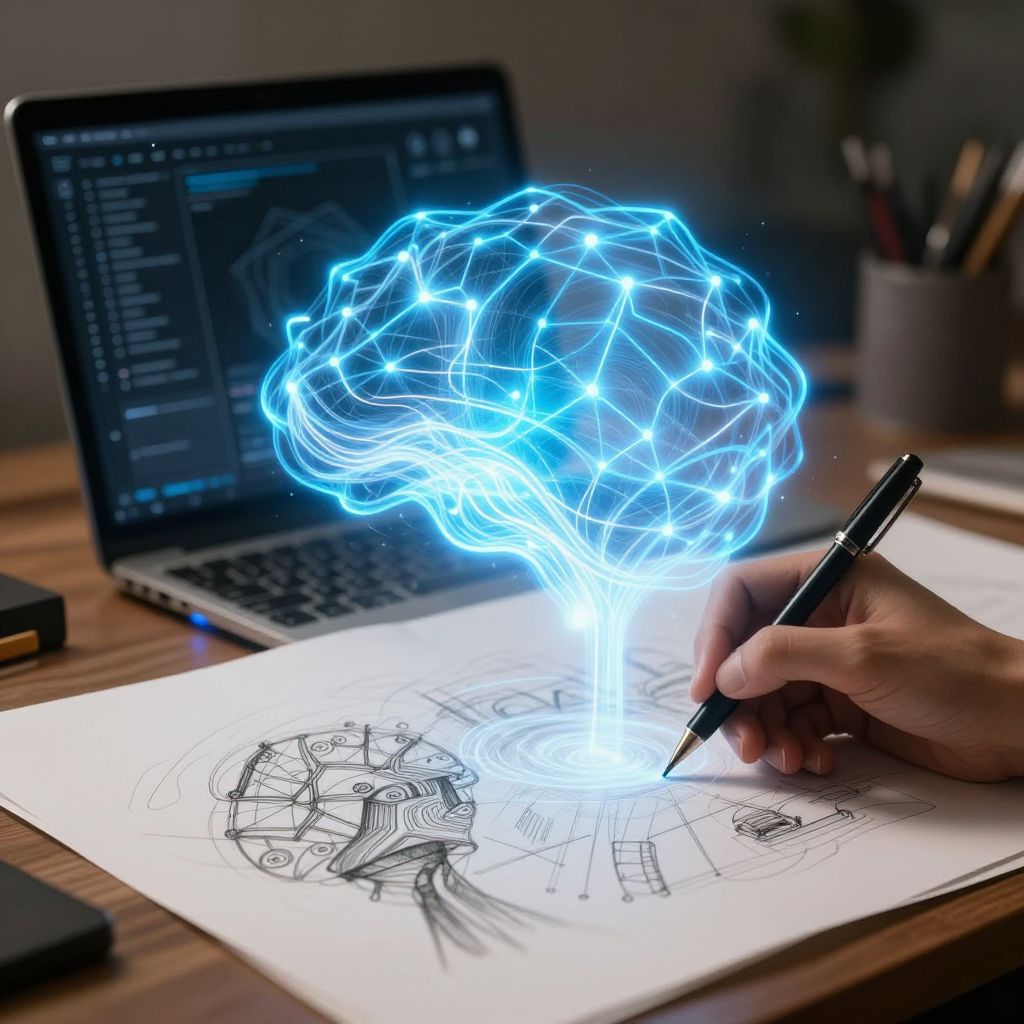 Sketch AI generator concept, futuristic digital art interface, glowing neural network patterns blending with pencil sketches, intricate AI algorithms visualized as swirling light trails, high-tech creative workspace, detailed textures, soft ambient lighting