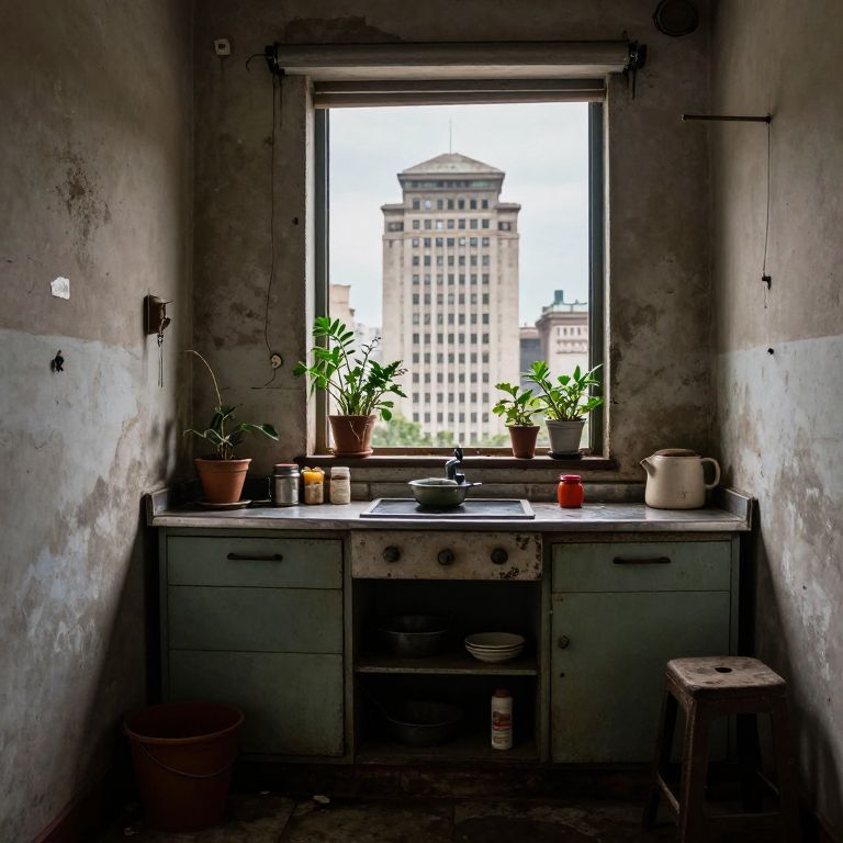 An old, vintage kitchenette in a dirty apartment in Mexico City, featuring untangled walls, a window view of a huge, imposing building, and various plants and kitchen items.