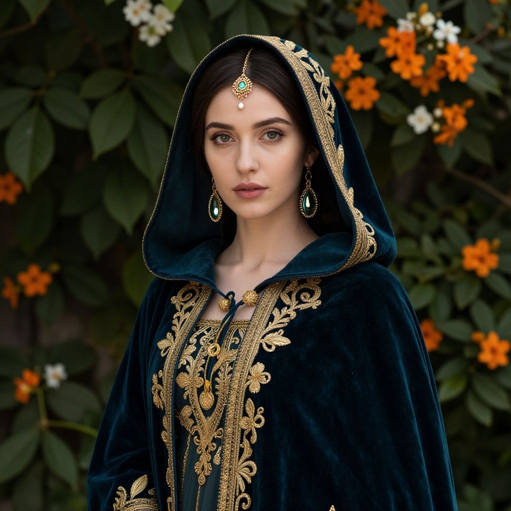 Portrait of a woman wearing a luxurious dark teal velvet hooded cloak adorned with intricate gold embroidery and matching earrings. She has a delicate golden headpiece on her forehead. The background consists of lush green leaves and vibrant orange and white flowers, creating a mystical and elegant atmosphere.