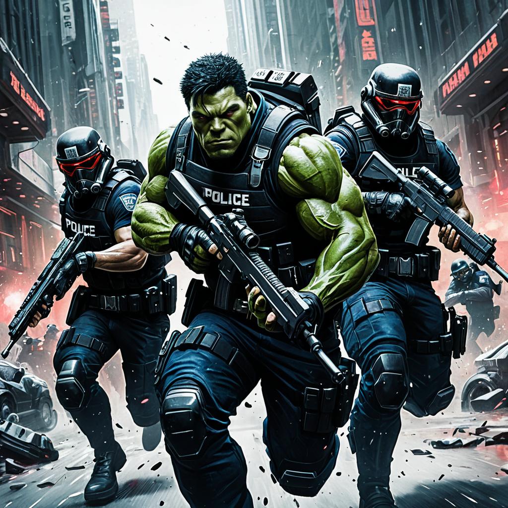 A digital illustration of a futuristic urban scene featuring a group of heavily armored soldiers and a green muscular character resembling Hulk, all armed with advanced rifles. The background displays a neon-lit cityscape with tall buildings and glowing signs, creating a vibrant sci-fi atmosphere.