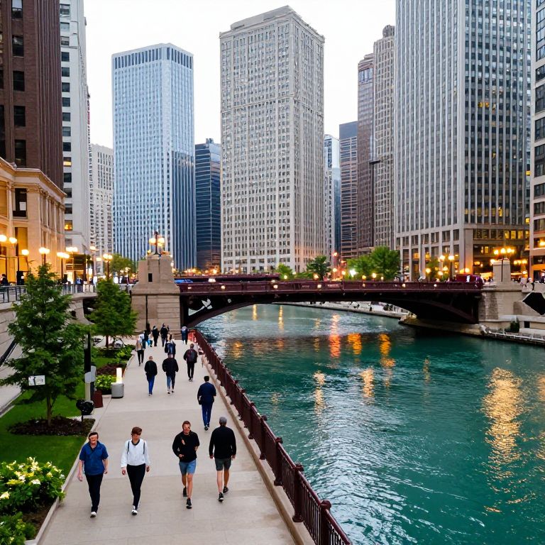 Chicagoans stroll along the vibrant Riverwalk, a pedestrian bridge spanning the turquoise Chicago River, illuminated by warm lights that reflect off the water's surface, offering a scenic view of towering skyscrapers and urban greenery.