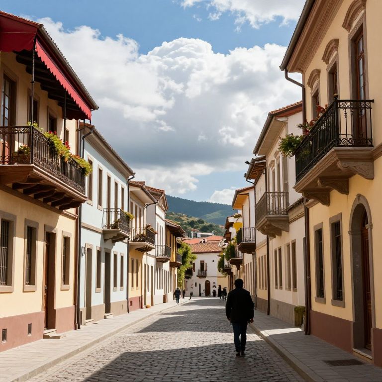 Sunlit cobblestone streets stretch between rows of ornate, pastel-colored buildings, their balconies adorned with red awnings and greenery, as a lone figure in a dark coat walks away toward a horizon framed by towering clouds and distant hills.