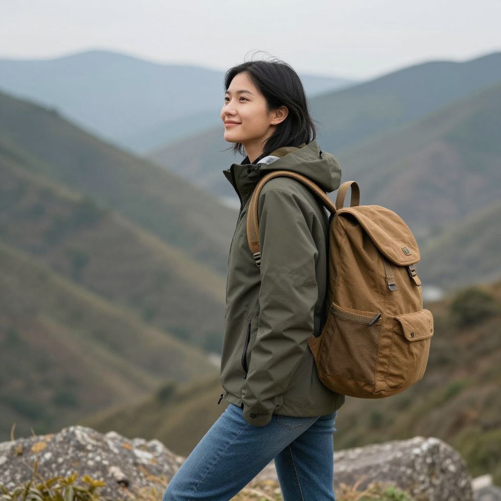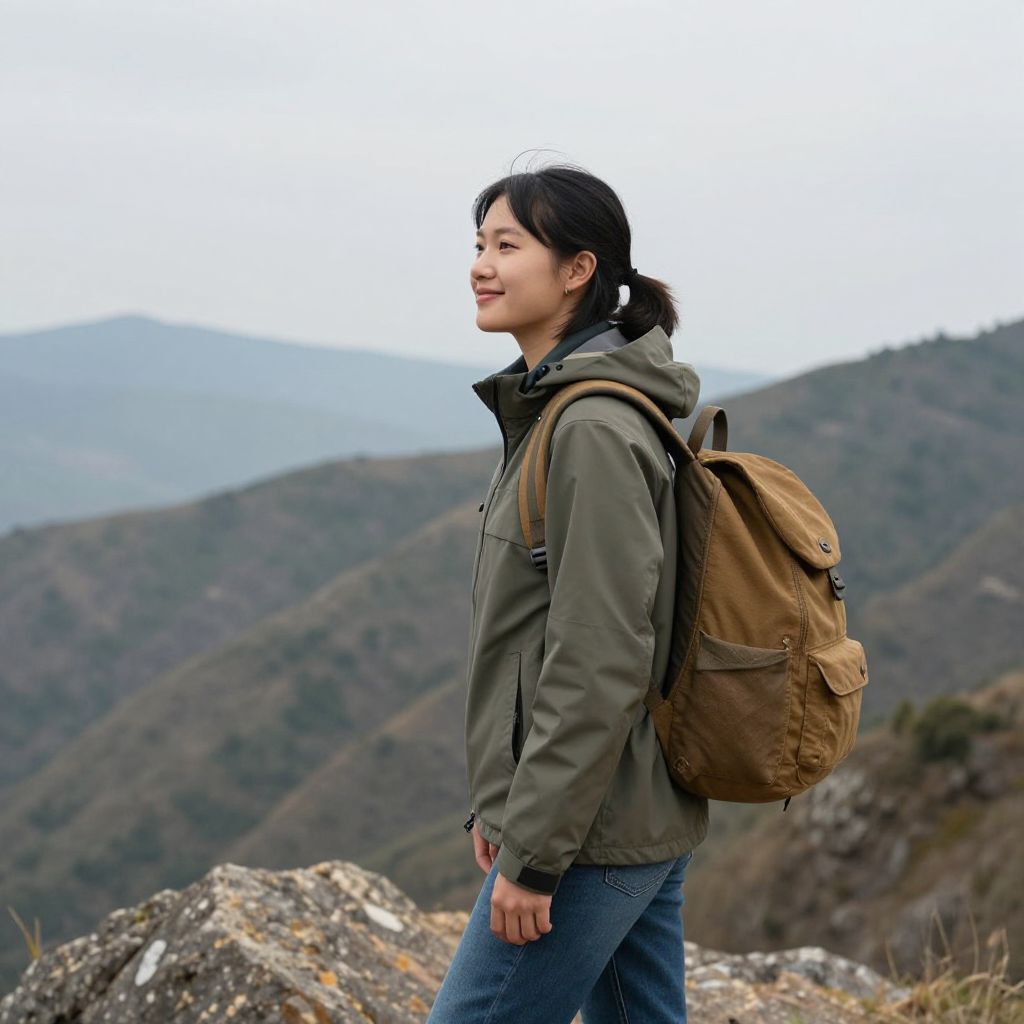 Photograph of an Asian woman with medium skin tone, black hair in a ponytail, wearing a green hooded jacket, blue jeans, and a brown backpack, standing in profile against a mountainous landscape. She smiles slightly, looking to the right. The background features blurred, rolling hills covered in green and brown foliage under an overcast sky. The rocky terrain in the foreground includes large, weathered boulders. The image captures a sense of adventure and natural beauty.