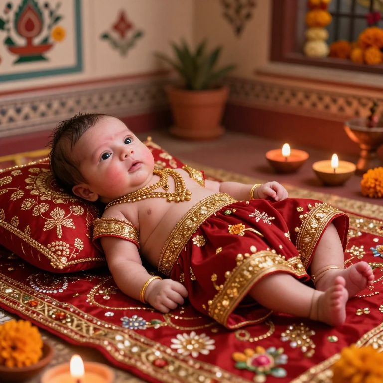 Photograph of a baby with light brown skin and black hair, lying on a rich red and gold embroidered cloth. The baby is adorned with a gold necklace and bangles, and wears a matching gold and red cloth around the waist. The background includes a potted plant, lit candles, and marigold flowers. The setting has traditional Indian decor with ornate wall patterns and a window. The baby gazes upwards with a calm expression, surrounded by warm, soft lighting.