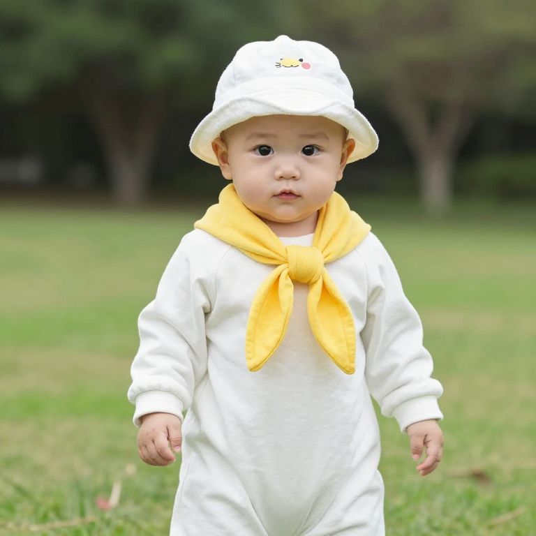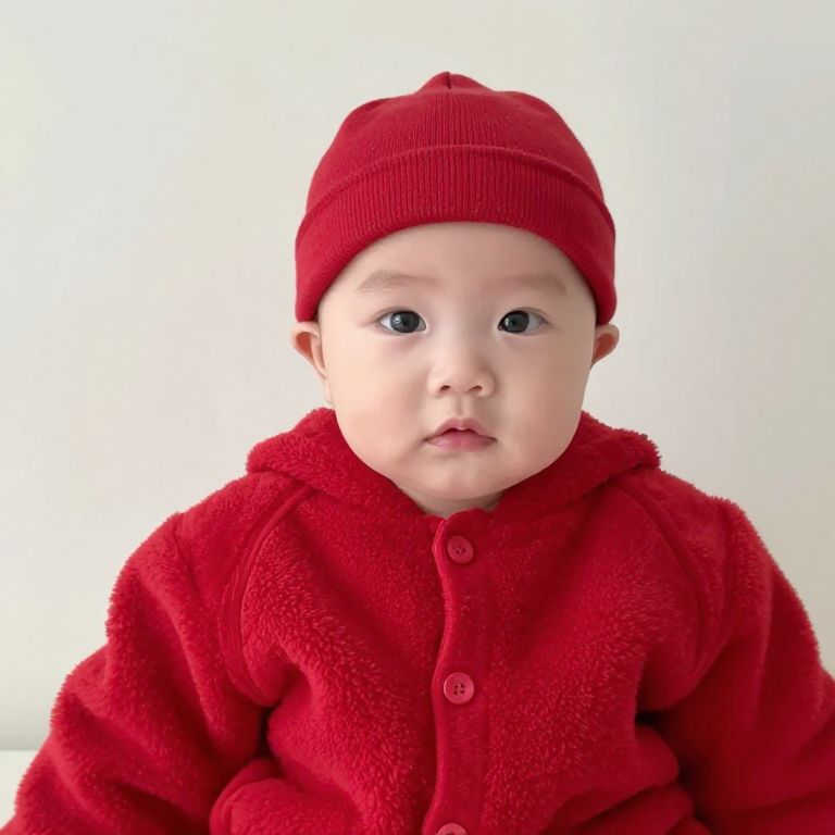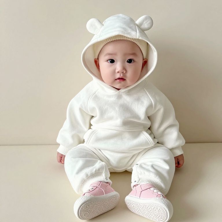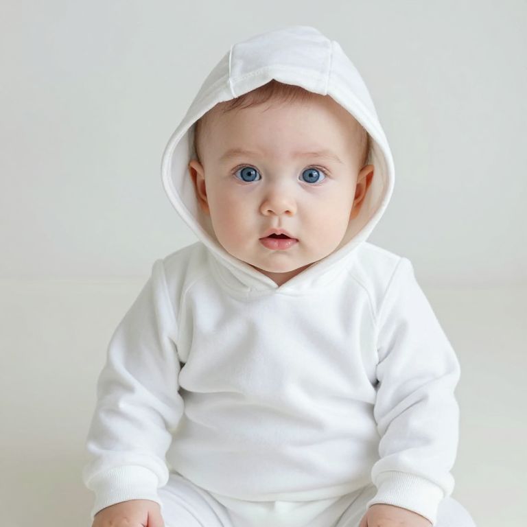 A baby is wearing a blue outfit with a hood and a hoodie. The baby is sitting on a blue truck with black tires.