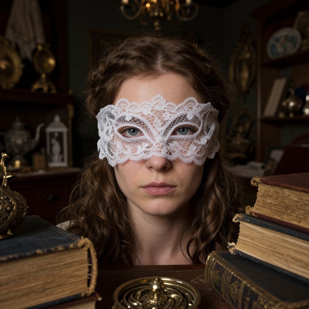 Envision an ultra-realistic portrait of a Slavic woman, her enigmatic gaze concealed by a lace mask, set amidst an antique shop's atmosphere filled with mysterious artifacts and ancient tomes. The lighting, both dramatic and ethereal, highlights her features from a unique 'bug's-eye view', casting soft shadows across the dimly lit room. This captivating scene evokes a sense of wonder as her serene blue eyes seem to peer through layers of history, inviting viewers into an exploration of untold stories hidden within this mesmerizing portrait.