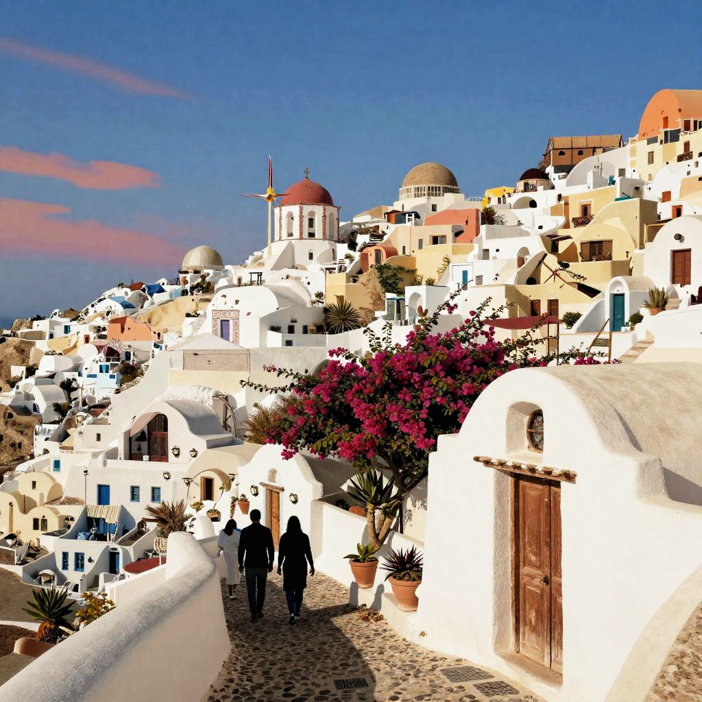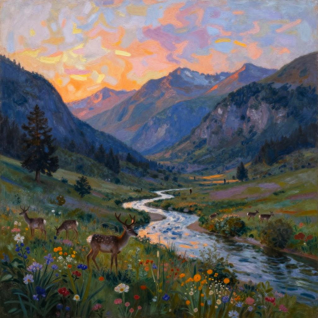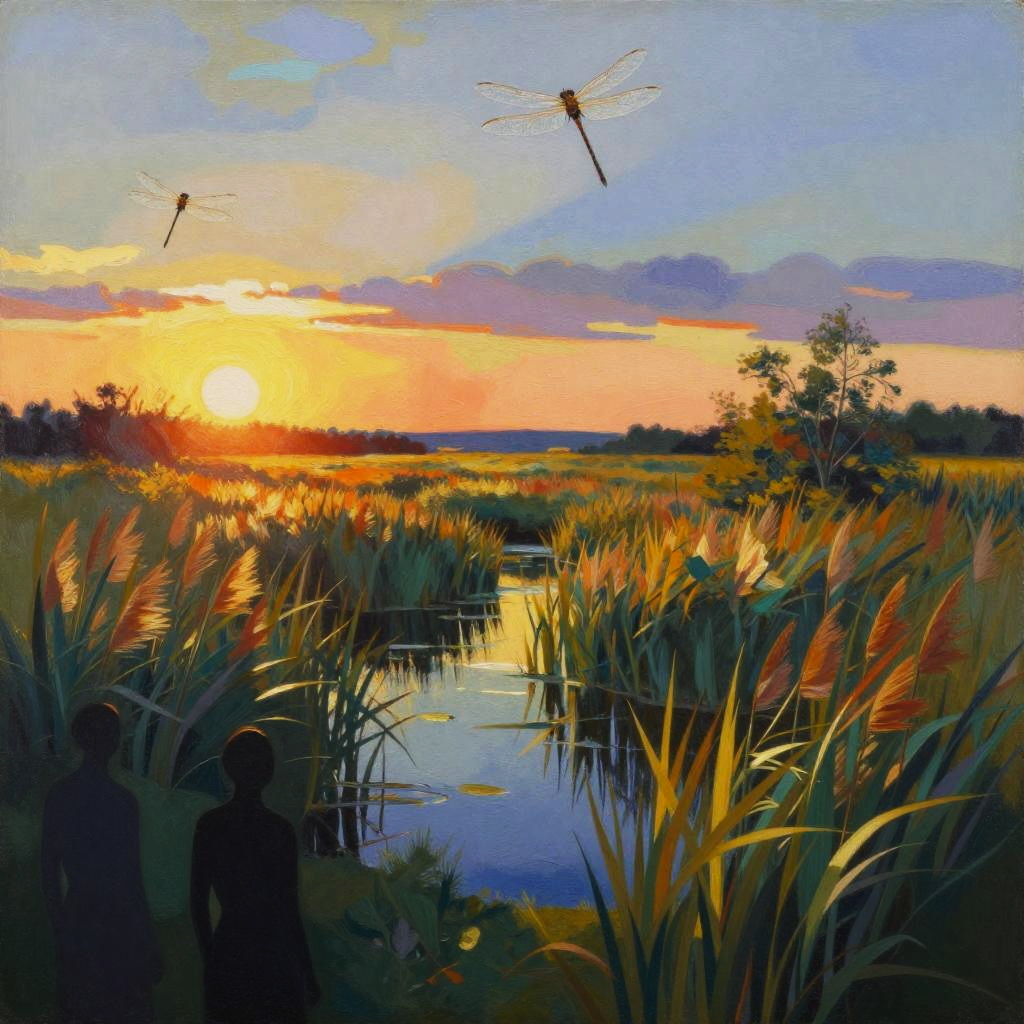 Twilight scene of a lively carnival featuring illuminated carousel horses, colorful circus tents with flags and banners, and costumed performers. People walk around under a twilight sky with warm and cool tones, creating a vibrant and festive atmosphere resembling a modern artistic style.