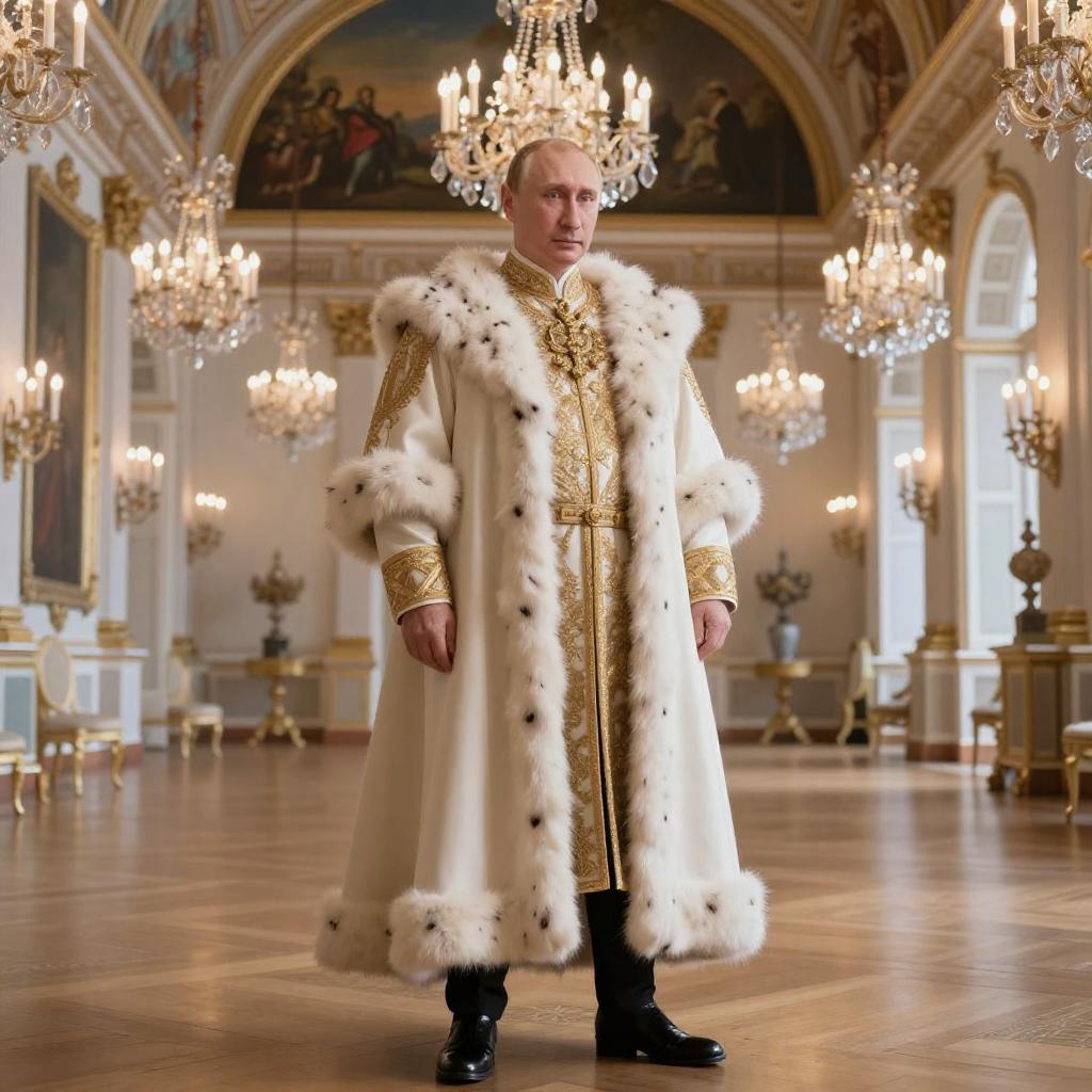 Putin costume, regal imperial robes with golden accents and fur trim, standing in a grand palace hall filled with chandeliers and historic paintings, realistic style