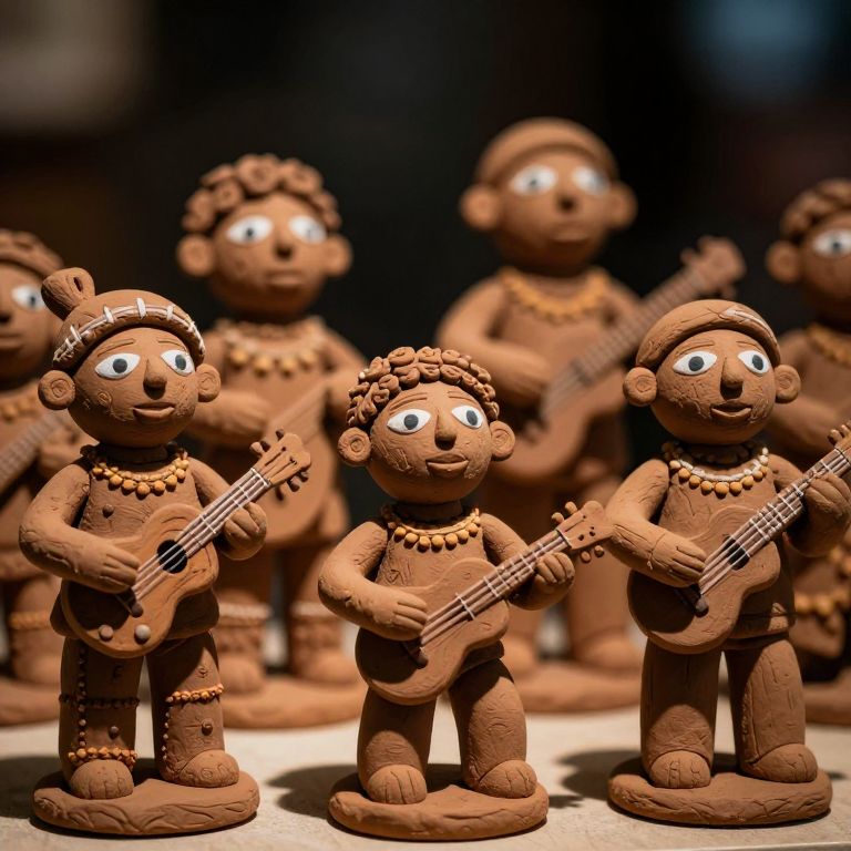 A blurred bokeh effect softens the background, focusing on clay sculptures of Brazilian musicians under intense dramatic lighting, Figures in iconic attire hold instruments, Expressive, hand-crafted faces with painted eyes add charm, Earthy tones celebrate Brazilian culture, High contrast and sharp focus on subjects