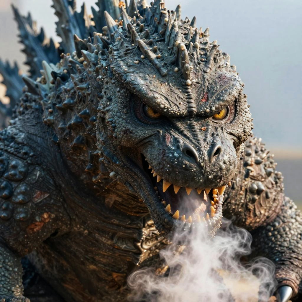Photorealistic CGI of a fearsome Godzilla-like monster with dark, scaly, textured skin and sharp, jagged spikes running down its back. Its piercing yellow eyes and wide, menacing mouth, filled with large, yellowed teeth, are prominent. The creature's nostrils flare as it exhales a bright, white cloud of smoke from its mouth. The background is a blurred, bright blue sky. The detailed texture of the monster's skin and spikes adds a sense of realism, emphasizing its formidable appearance. The lighting highlights the rough, rocky texture of Godzilla's skin.