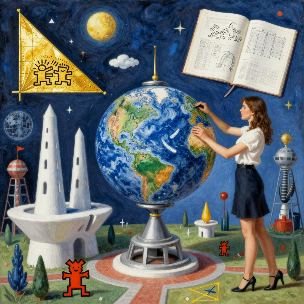 Realistic photo.Conceptual image inspired by Keith Haring and Marc Chagall blending surrealism and sci-fi, featuring a mathematically designed architectural utopia with a miniskirt-clad woman assembling the world, blueprints, golden ratio, and futuristic perspectives realistic photo