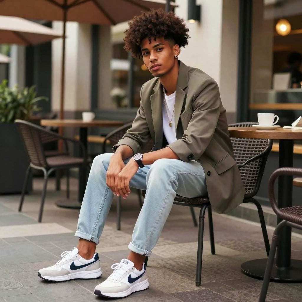 Drop Fade Afro hairstyle on young man, wearing modern casual blazer and sneakers, in modern cafe patio, captured in fashion editorial style with soft daylight with natural shadows.