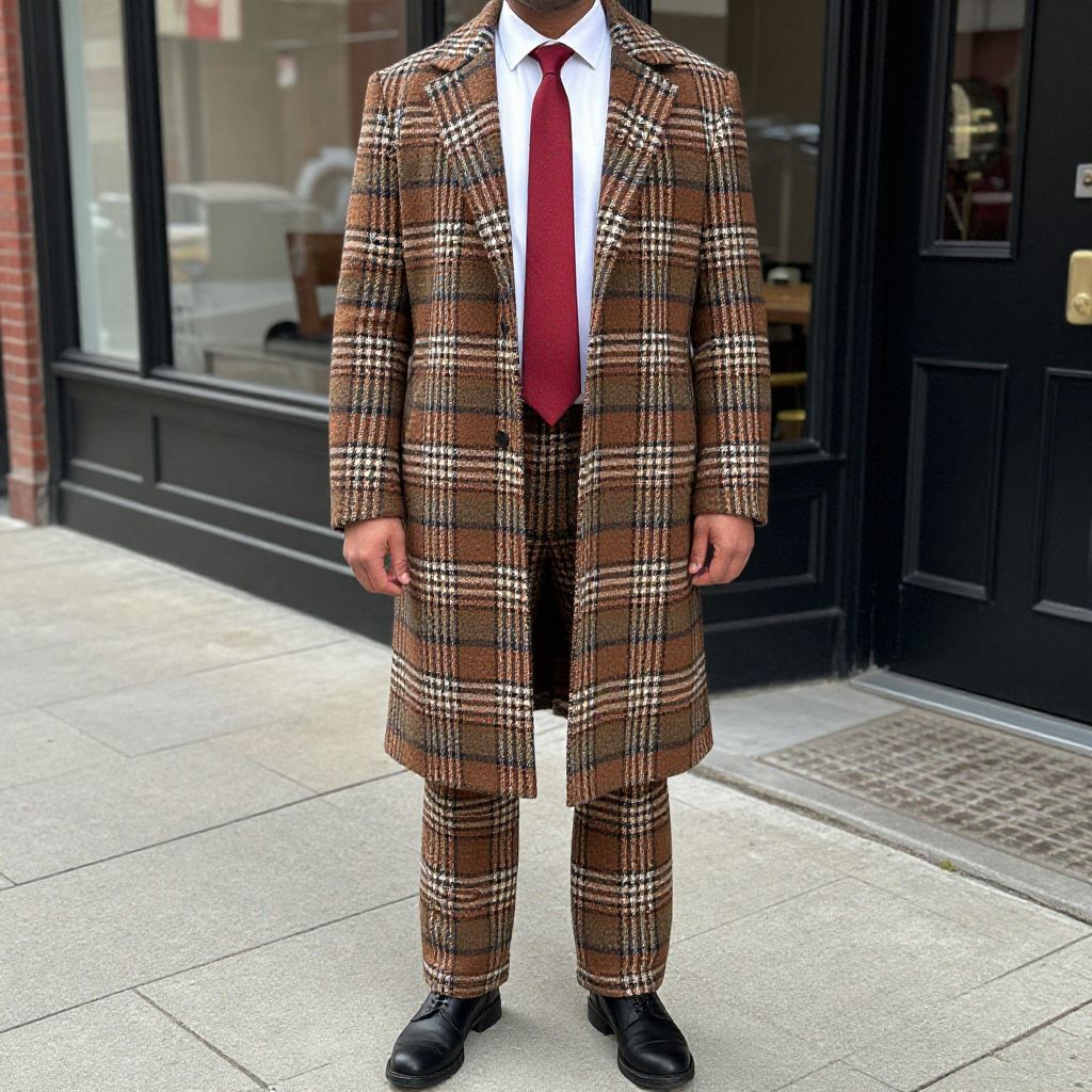 Plaid Clothes Costume, man in a plaid coat and tie standing on a sidewalk