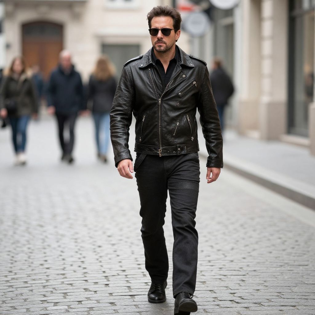 Man Leather Outfit Costume, man in leather jacket walking down a street