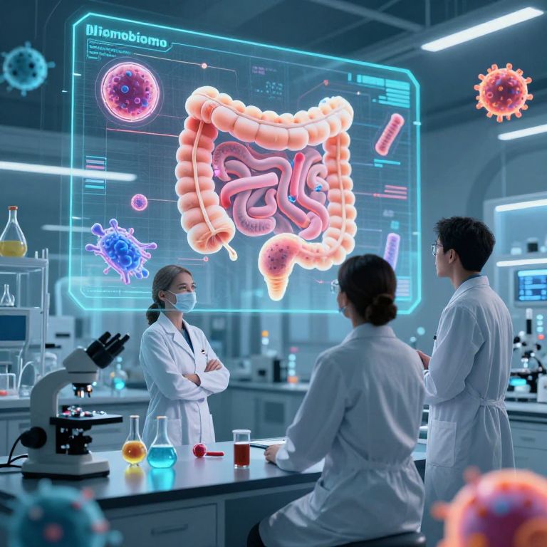 Microbioma concept art portraying a futuristic lab scene, scientists observing holographic projections of gut microbes, detailed scientific instruments around, glowing microbial shapes in the air, highly detailed