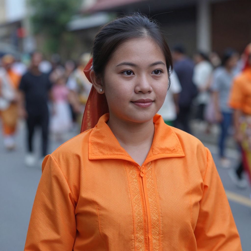 Simple Sinulog Female Costume, a close up of a woman in an orange jacket standing on a street