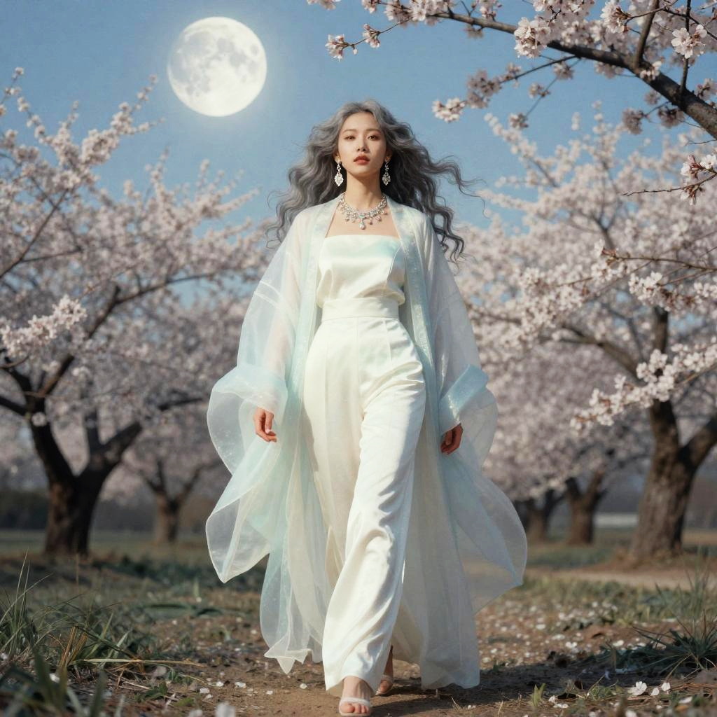Analog film photo ethereal fantasy concept art of masterpiece, ultra realistic, 32k, extremely detailed CG unity 8k wallpaper, best quality, (spring day ), an asain girl in a hanfu, necklace, eardrop, ( fluorescent Wear a tailored jumpsuit with statement earrings and heels. ), grey hair hair Beachy waves, Moonlight . magnificent, celestial, ethereal, painterly, epic, majestic, magical, fantasy art, cover art, dreamy . faded film, desaturated, 35mm photo, grainy, vignette, vintage, Kodachrome, Lomography, stained, highly detailed, found footage