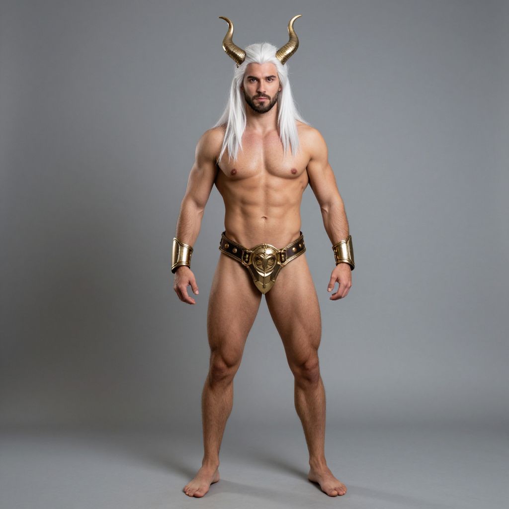 Photograph of a muscular, bearded man with white hair, horned headpiece, and gold bracelets, wearing a loincloth with a belt