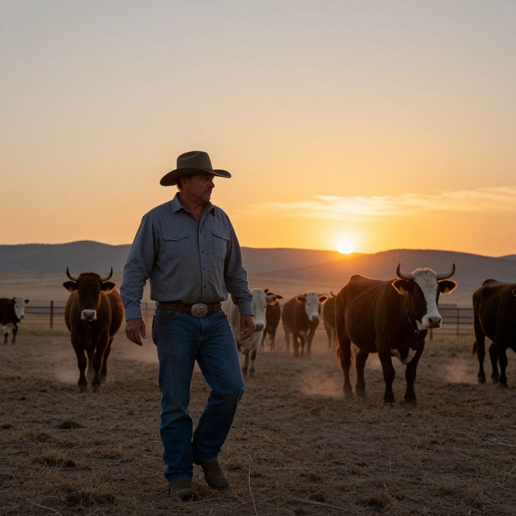Texan man working on a ranch at dawn, wearing a wide-brimmed hat and rugged outdoor gear, guiding cattle through dusty plains, with rolling hills and a fiery sunrise painting the sky in warm hues, showcasing strength, resilience, and rural life charm.