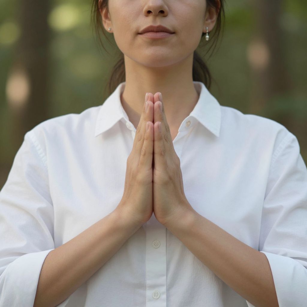 Photograph of a woman with medium skin tone and straight dark brown hair tied back, standing outdoors with a blurred green forest background. She is wearing a white, long-sleeved button-up shirt and has her hands pressed together in a prayer position at chest level. Her face is partially visible, showing closed lips and a calm expression. She is wearing small, simple earrings. The lighting is natural, highlighting the white shirt against the green background. The image has a calm, meditative atmosphere.