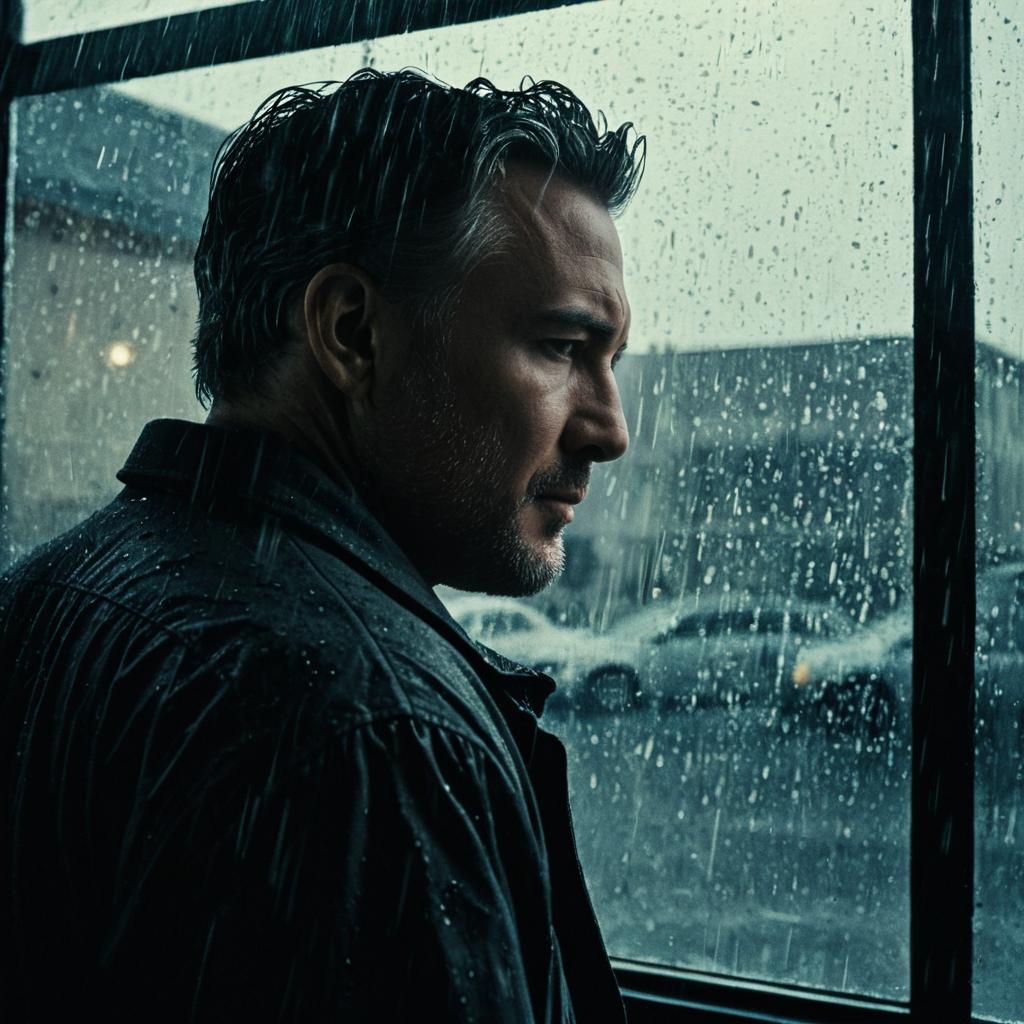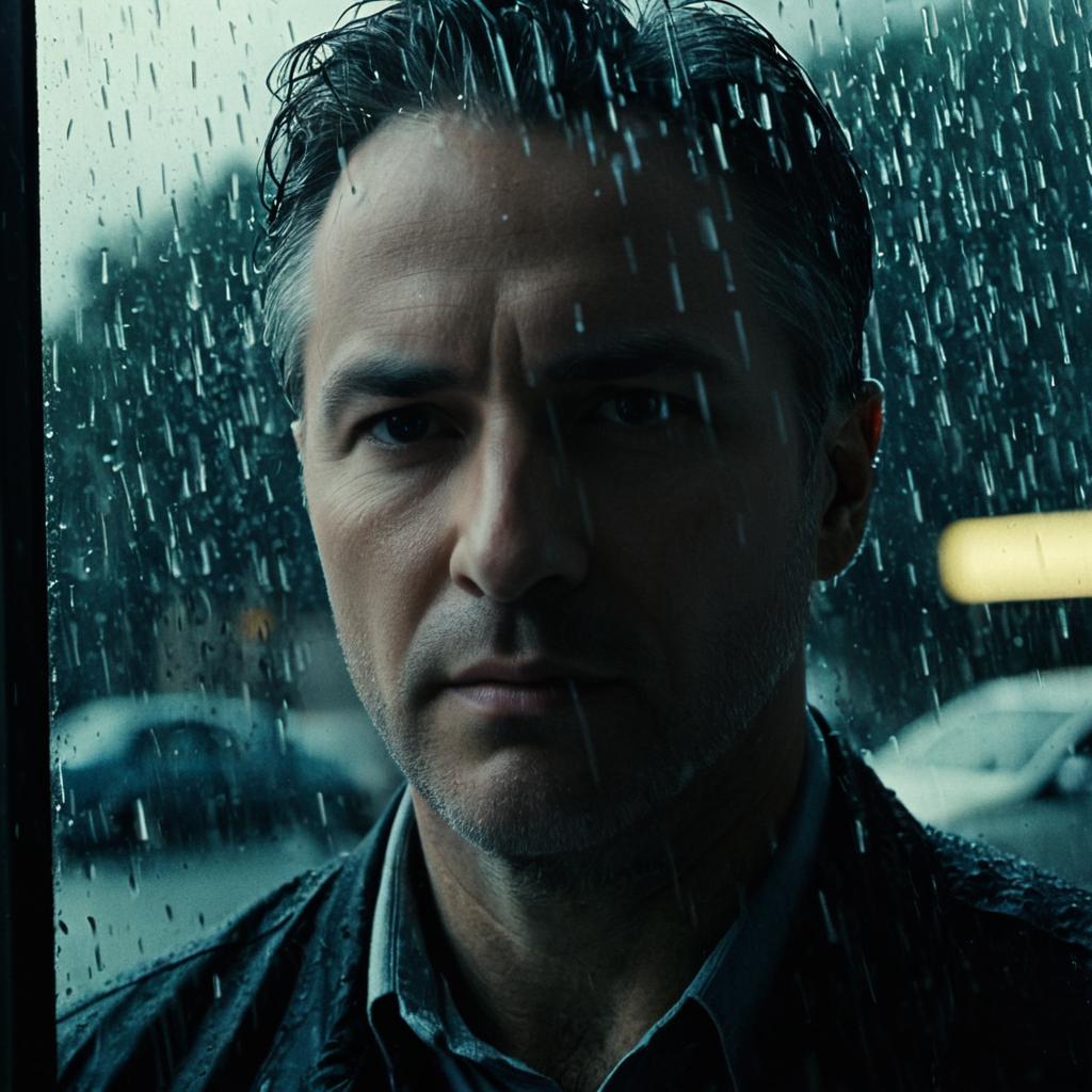 A dramatic film still inspired by David Fincher, depicting a skeptical tabloid reporter with fatigued skepticism, framed in wide-angle lens with heavy vignette and cluttered room setting
