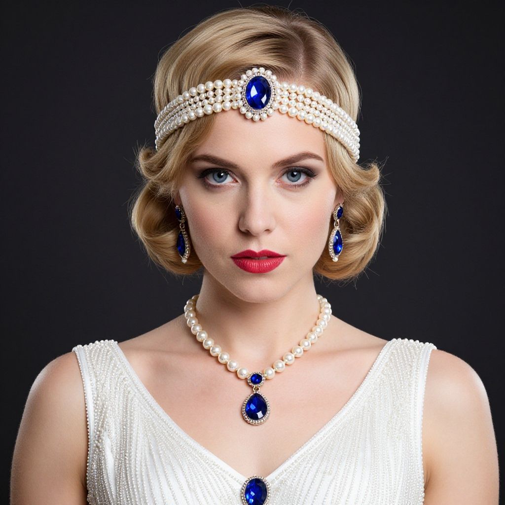 Portrait of a young blonde woman wearing a white flapper costume adorned with pearl and gemstone jewelry. She has blue eyes, styled short hair, and red lipstick. The costume features intricate beading on the dress and matching pearl headband with a central blue gemstone, pearl necklace with a blue pendant, and matching earrings. The image is a high-quality, realistic close-up against a dark background.