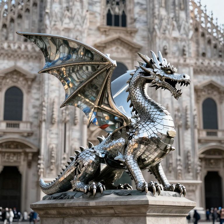 Perched atop a cathedral's spire, a gargoyle of mirrored scales reflects not just light but the whispers of alternate realities, its metallic form resonating with the eternal tension between the celestial and the earthly, while the soft hum of the city below echoes the quiet solitude of its timeless vigil.