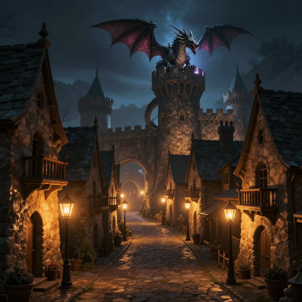 Medieval fantasy town under stormy skies, ancient stone walls, market square filled with adventurers, enchanted artifacts displayed, dramatic lighting and shadows, medieval epic fantasy illustration