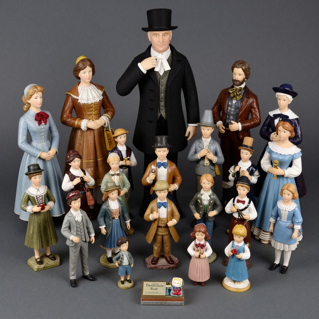 Photograph of detailed Victorian-era doll collection featuring 17 dolls in period clothing, including men in top hats and women in long dresses, standing against a