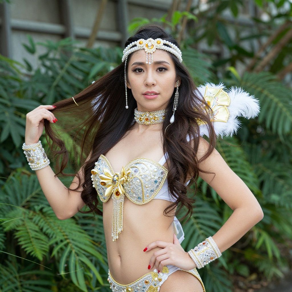 Portrait of a Japanese Brazilian woman with long flowing hair, wearing a mix of samba carnival costume and delicate Japanese accessories, surrounded by lush greenery