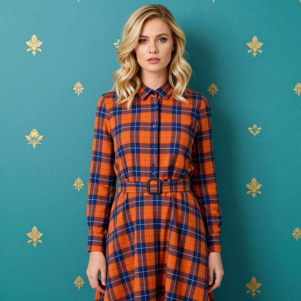 Photograph of a blonde woman with wavy hair, wearing a long-sleeved, orange and blue plaid dress with a belt. She stands against a teal wall adorned with small, gold floral patterns. Her expression is neutral, and she has fair skin. The dress's checkered pattern contrasts sharply with the colorful background, creating a vibrant and stylish look.