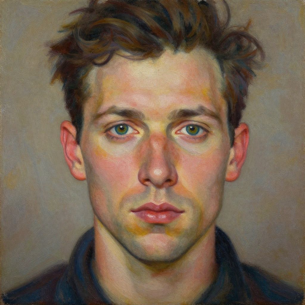 A captivating portrait of a man depicted in an artistic oil painting style reminiscent of Mandy Jurgens' work, featuring vibrant colors and meticulous detail that enhances the subject's striking features.