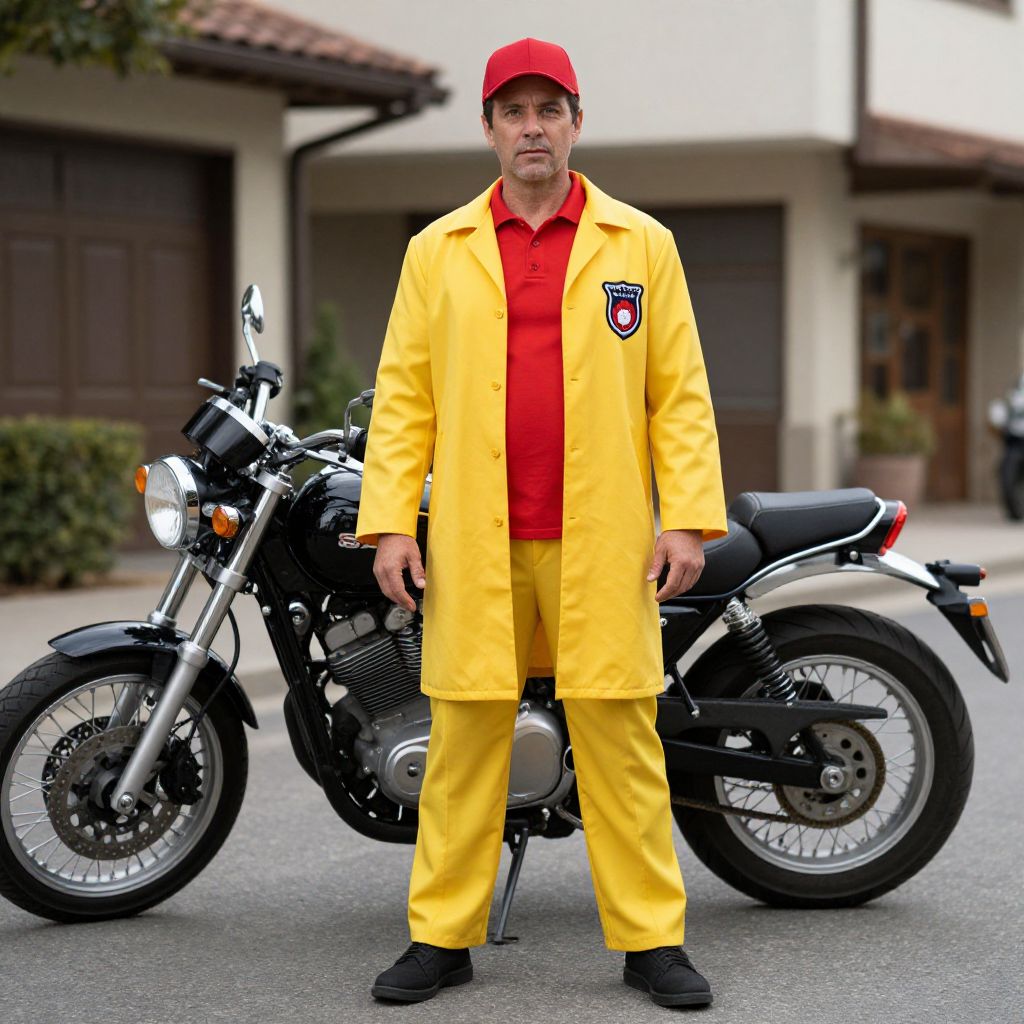 Photograph of a middle-aged man standing in front of a black motorcycle. He has a serious expression, light skin, and short brown hair, wearing a red cap, red polo shirt, and bright yellow jumpsuit with a logo patch on the left chest. The jumpsuit is long with matching yellow pants. He stands on a suburban street with beige houses and brown doors in the blurred background. The motorcycle has chrome details, a black seat, and silver wheels, positioned to the left of the man. The overall style is casual and slightly eccentric.