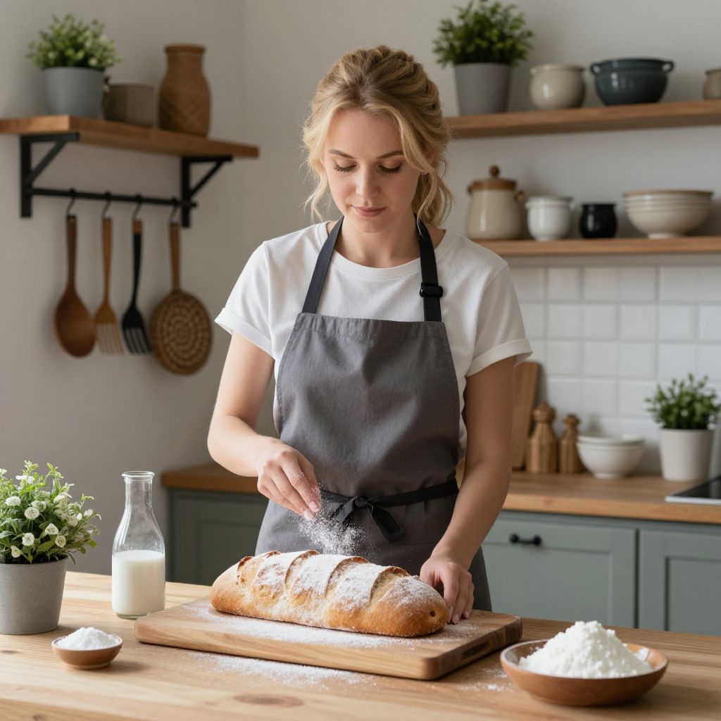 Blonde-haired woman wearing a gray apron stands in a cozy kitchen, carefully dusting powdered sugar onto freshly baked bread resting on a wooden cutting board, surrounded by rustic decor including hanging utensils, potted plants, and open shelving filled with ceramic pots and bowls.