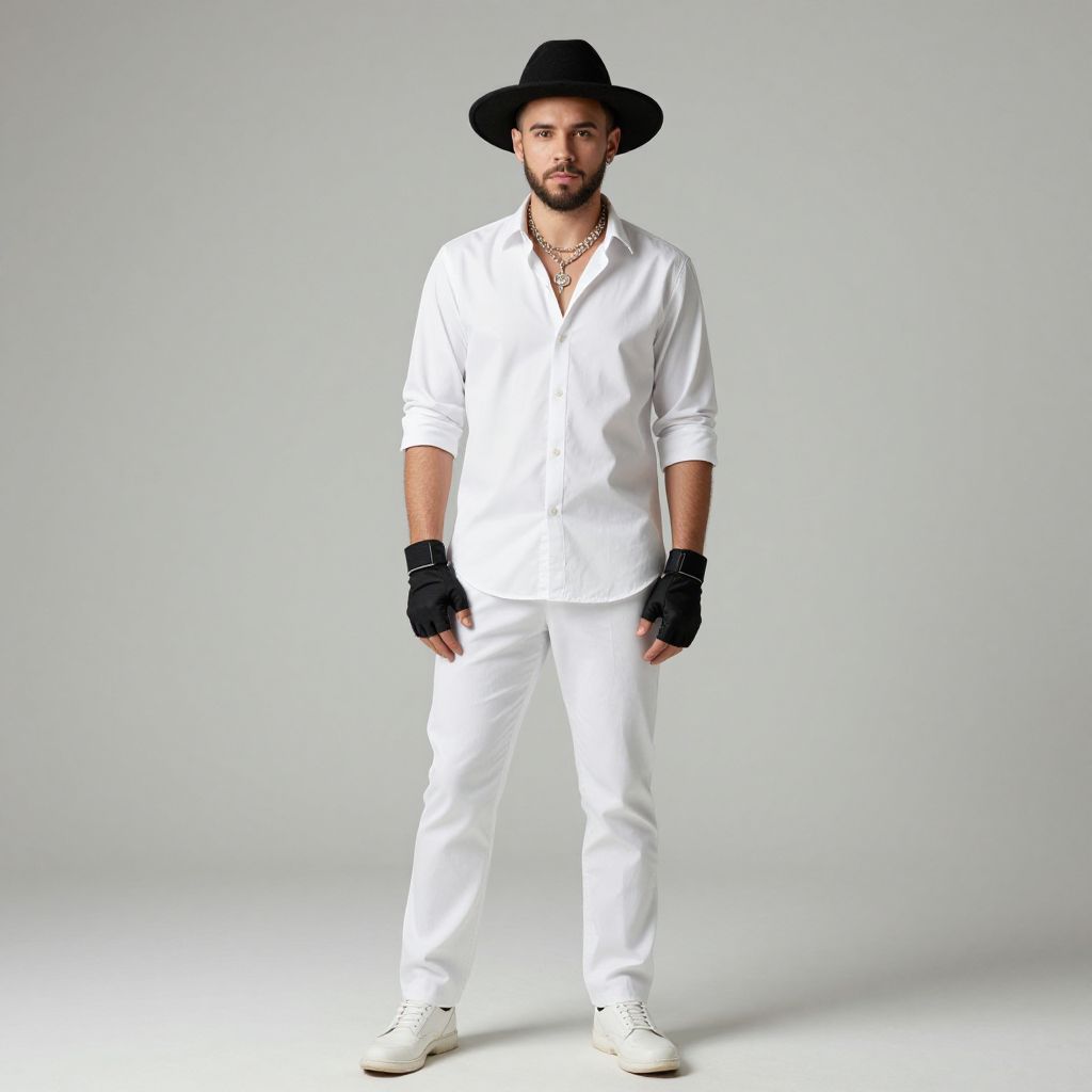 "creative costume guy, 1boy, male focus, solo, facial hair, jewelry, beard, hat, gloves, necklace, full body, fingerless gloves, standing, pants, white footwear, shirt, looking at viewer Realistic photo of casual sexy person with pretty face"