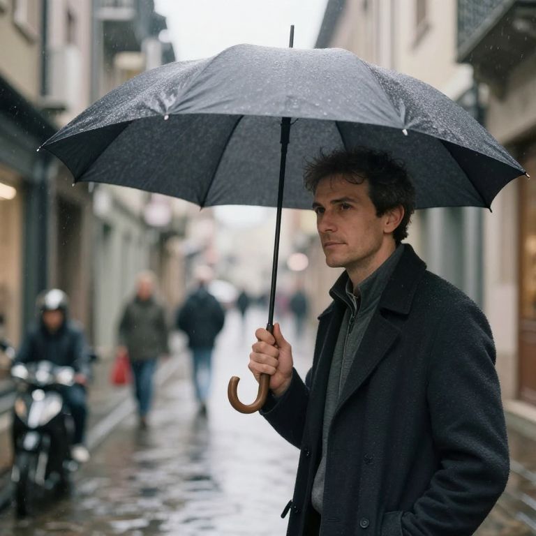 Photograph of a young man with short, curly dark hair, holding a black, rain-speckled umbrella with a wooden handle. He wears a dark coat and a gray scarf, standing on a wet, cobblestone street in an urban area. The background is slightly blurred, featuring pedestrians, a motorbike on the left, and buildings with lit windows. The overcast sky and street glisten from recent rain, creating a moody, atmospheric setting. The man's expression is serious, and he is positioned slightly to the right of the center.