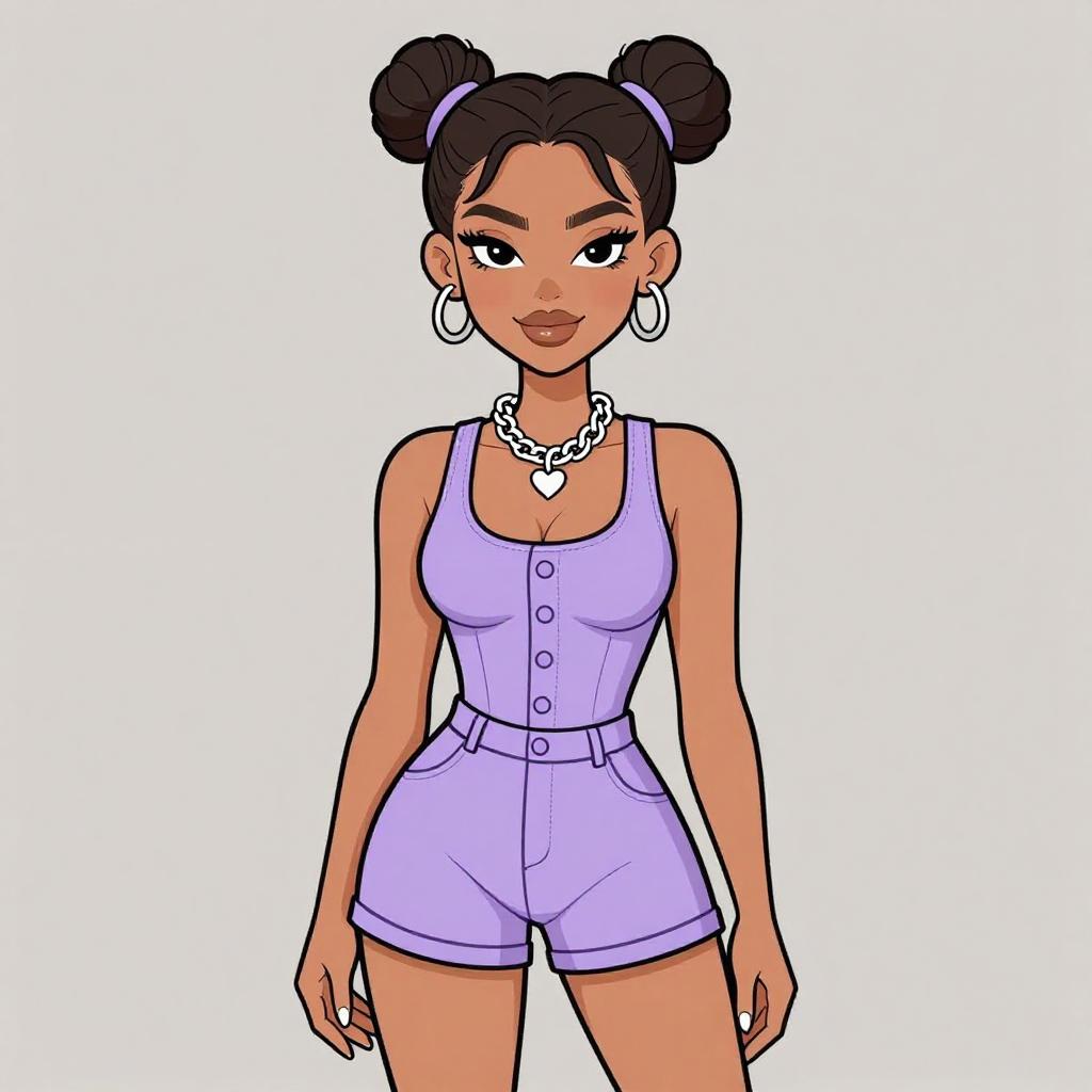 Digital anime-style drawing of a cute young woman with black hair in double buns, wearing a shiny blue sleeveless dress with a star, against a