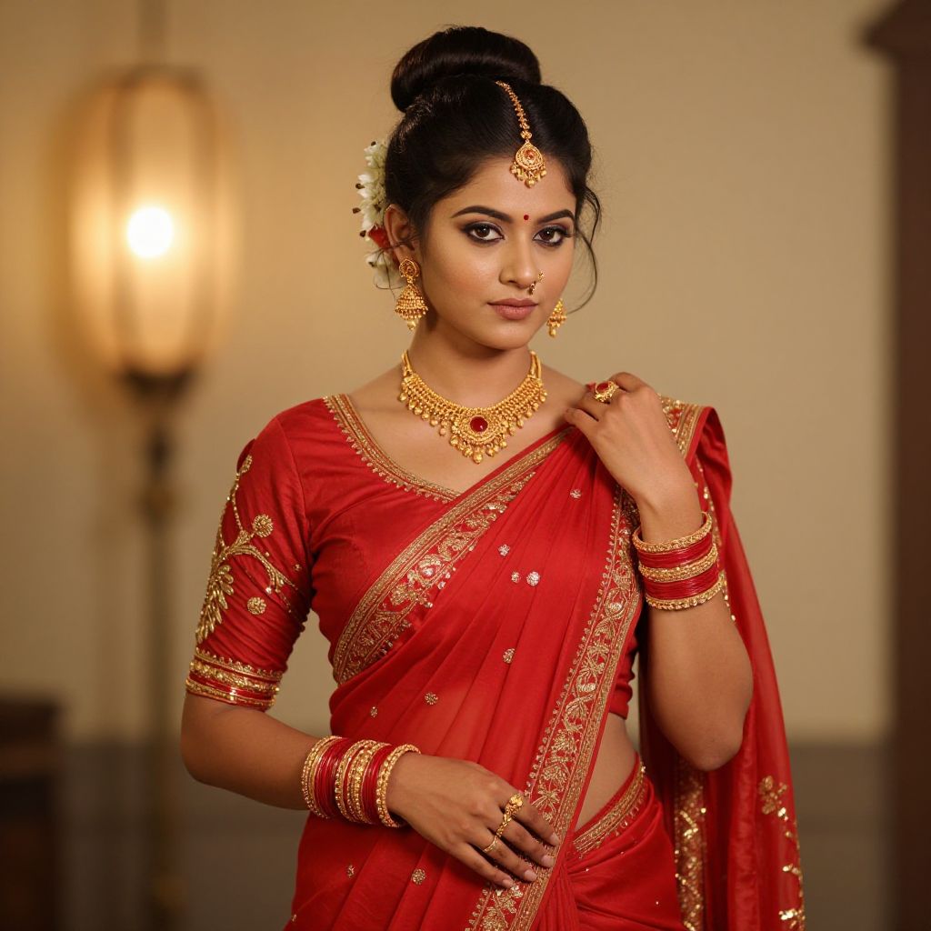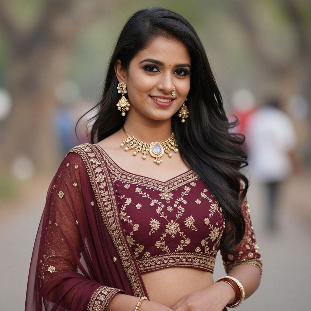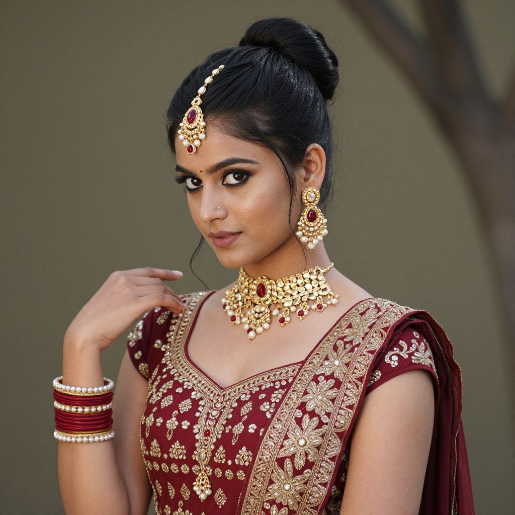 "dance costume bollywood, 1girl, solo, jewelry, necklace, black hair, earrings, realistic, hair bun, hair ornament, bracelet Realistic photo of casual sexy person with pretty face"