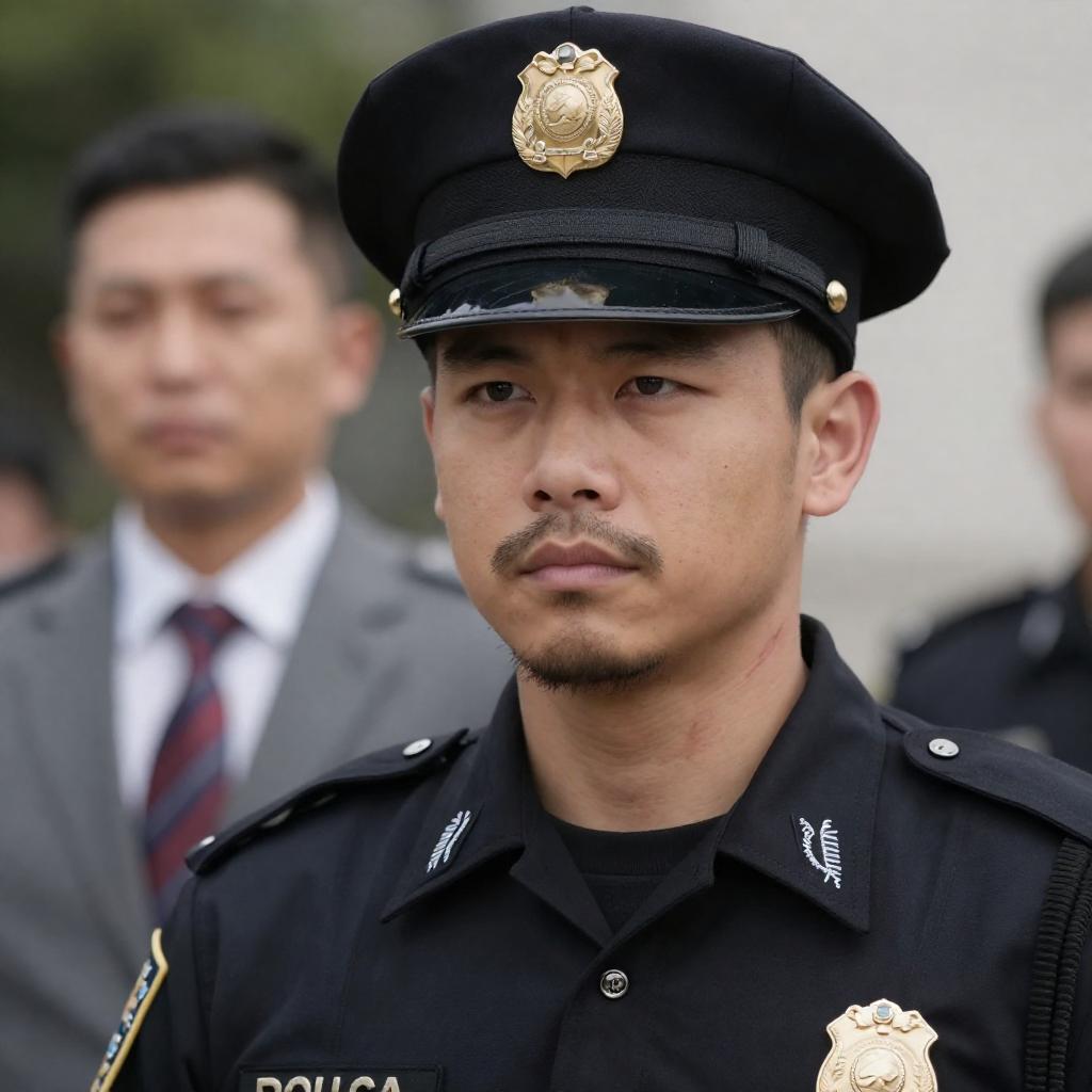 Photograph of a serious male police officer with light skin, short dark hair, and a trimmed beard, wearing a black uniform and cap with a gold badge. He has a bruise on his neck. In the blurred background, a light-skinned man in a gray suit and red-striped tie looks on.