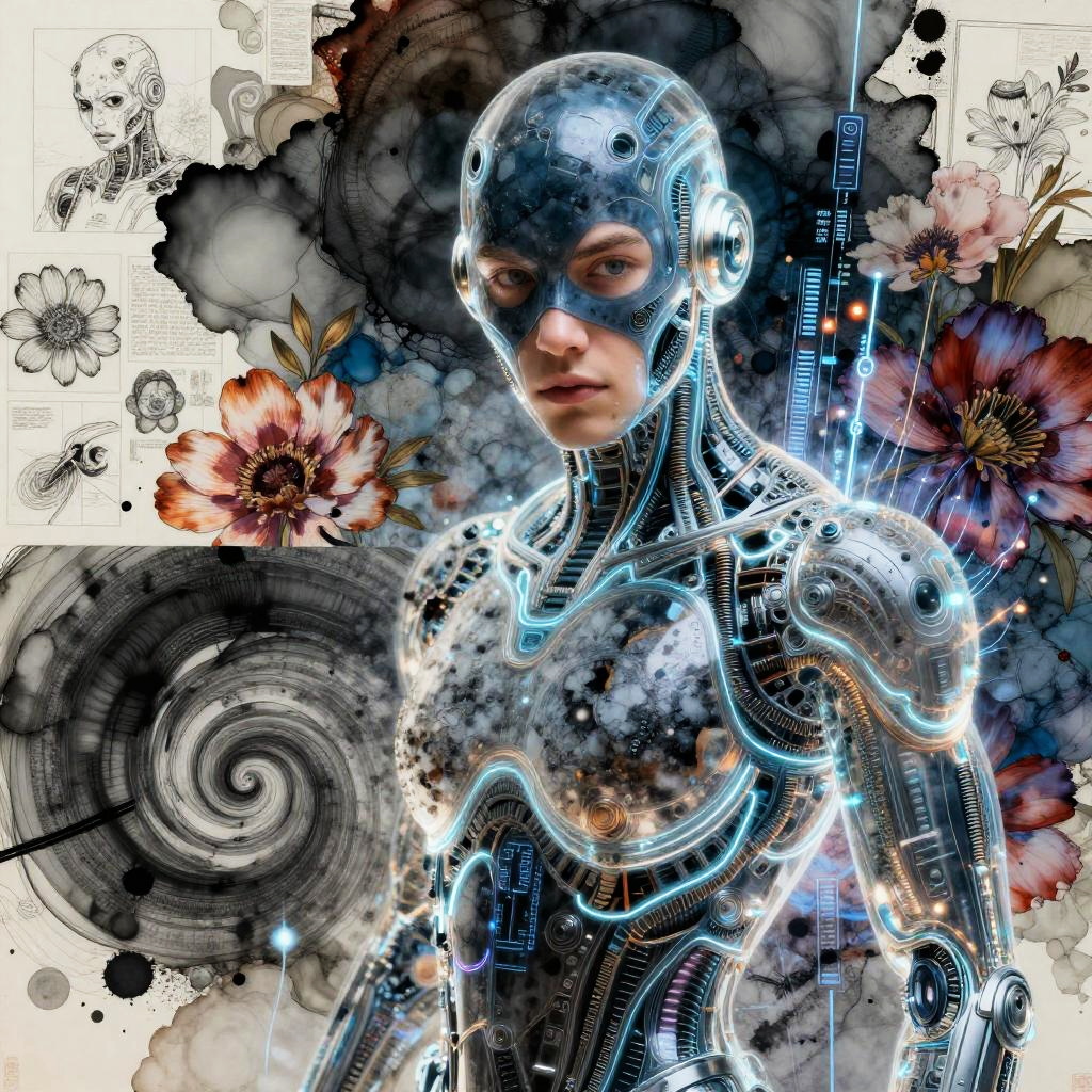 Looking at camera, futuristic android, neon glowing contoured filigree detailed marvel, transparent venom character, layered rough textured comic style artistic masterpiece, portrait, many tiny sketches in one art, cinematic magic, cyber realism, by Beeple, glowing data streams, detailed close-up dynamic color floral blossoming patterns, abstract expressionism, alcohol ink drawing, double exposure, book illustration, swirling spiral diptych two parts in one art.